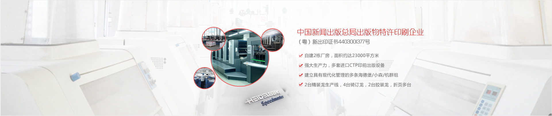 公司實(shí)力雄厚,設(shè)備先進(jìn)。 聚集了許多高等院校的尖端高級(jí)印刷專業(yè)人才,擁有國(guó)際頂尖的、全球最大的成套印刷設(shè)備— - 德國(guó)海德堡-對(duì)開(kāi)四色、五色、雙色、單色、四開(kāi)四色機(jī)等的主體印刷設(shè)備, 擁有高水準(zhǔn)后道加工系統(tǒng)—— 全電腦控制的斯塔爾折頁(yè)機(jī)、 STAHL 自動(dòng)折頁(yè)機(jī)、 全自動(dòng)鎖線機(jī)、 全自動(dòng)騎馬訂聯(lián)動(dòng)機(jī)、馬天尼膠裝龍、 程控切紙機(jī)、環(huán)保型過(guò)膠機(jī)、啤機(jī)等 精良裝備,整套印前印后設(shè)備。